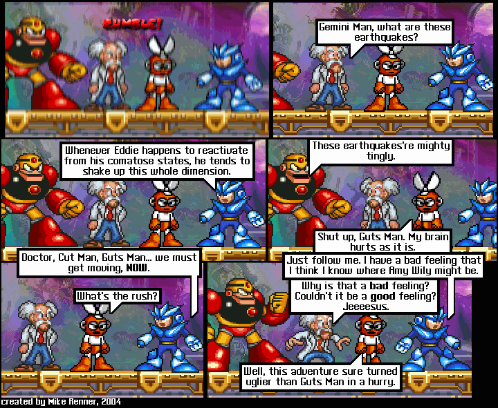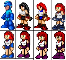 Here is something people don’t quite get: when making a female character from a Megaman sprite, you need to slim it down some. People for some reason don’t do this. Their females have Popeye arms, bell-bottom spandex, and look like they are wearing depends under the spandex. Mike Renner, Holly-Beth Kraft, and me all seem to screw this up one way or another. Plant Woman and Amy: (shudders). Sugar Bot waist is slimmed but not her hips, she looks like she is wearing a diaper. Becky/Toni: where are their waist and hips? Cammy: poor girl.