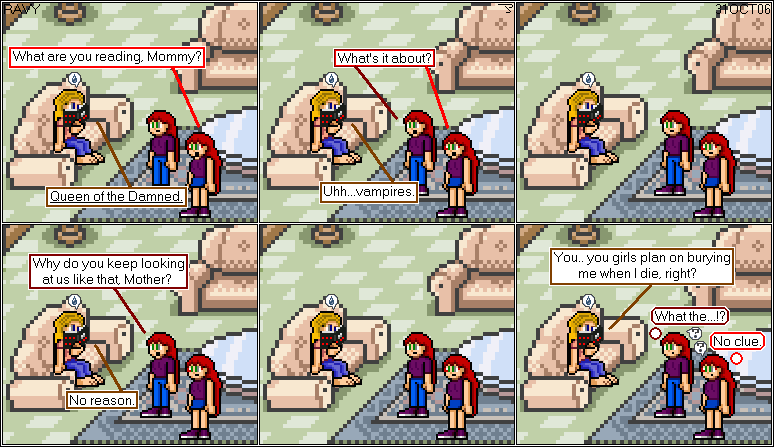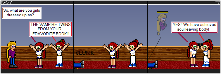 So far the absolute most mind boggling coincidence to date. Here are some facts: The book came out on 1988. Ravy Comics got started in 1987. In 1992 I created Becky, then in 1993 came Toni. They were seen together as twins for the first time in 2003. I saw this movie in 2004. Finally I read the book in 2005.