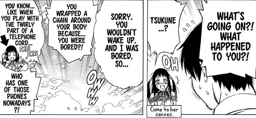 The real insight comes to Yukari. Normally on mind swaps the person gets a major insight to the person they have taken over. She sees herself from the outside and has the shock of her life. Her view of herself is completely destroyed when she finally realizes that she is a little girl with lots of growing yet to do. Of course, we can always count on Tsukune to tell her what her friends really think of her. So we can have that reset to zero by the next chapter.